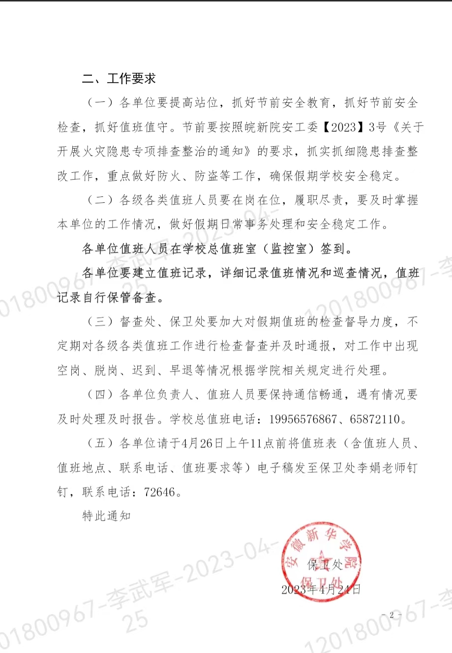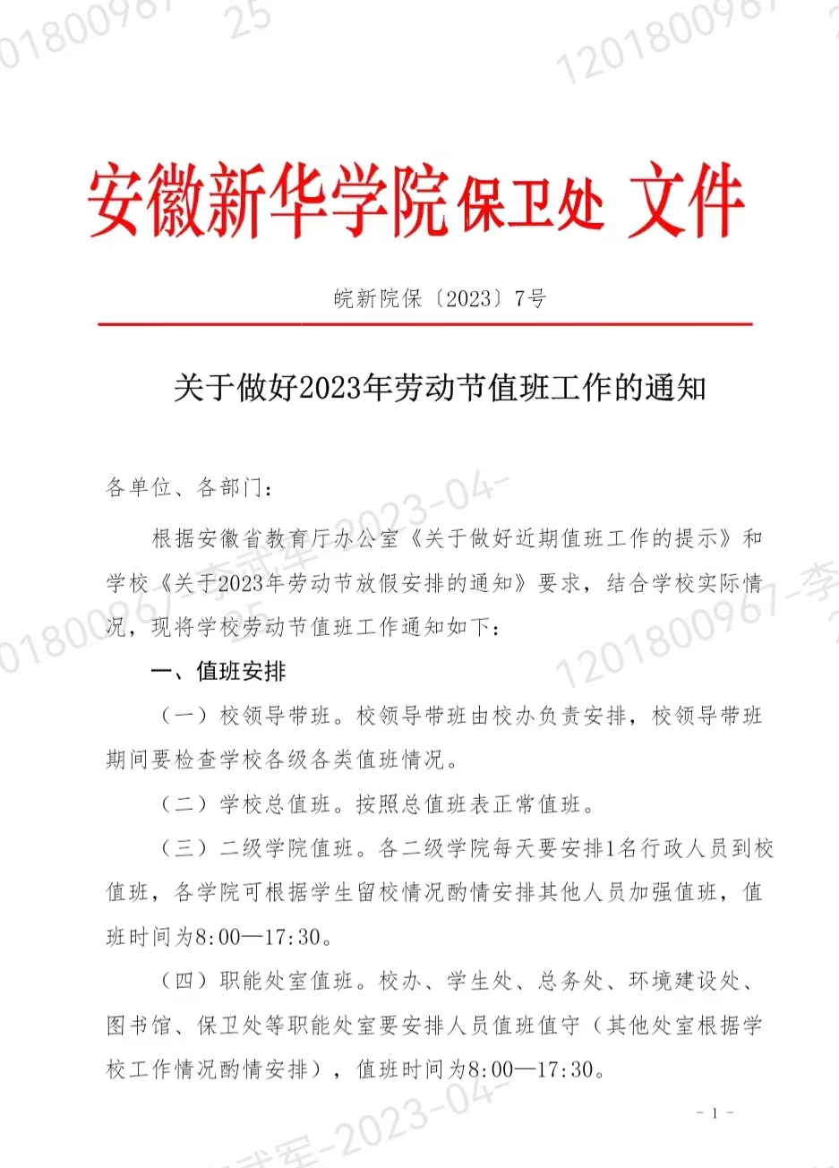 关于做好2023年劳动节值班工作的通知