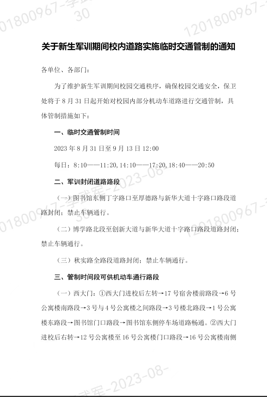 关于新生军训期间校内道路实施临时交通管制的通知