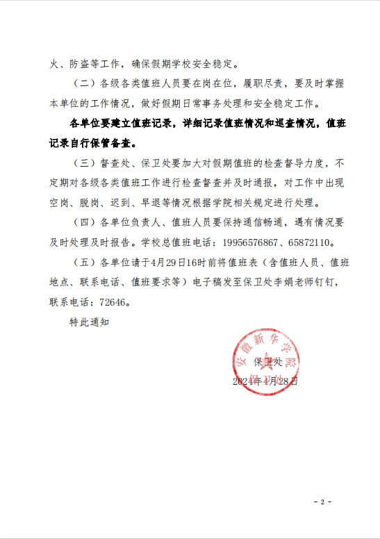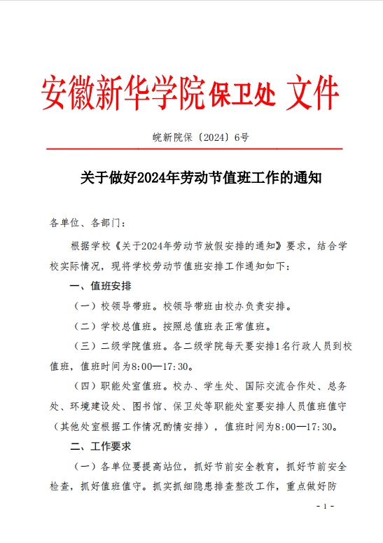 关于做好2024年劳动节值班工作的通知