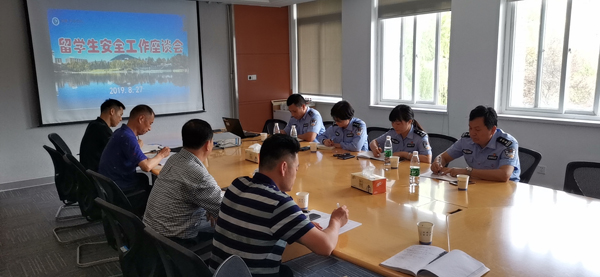 本网讯 (通讯员:仇陶)按照学校相关工作安排,结合我校留学生和外教管理的现状,8月27日上午,留学生安全工作座谈会在国教院二楼会议室召开,公安高新分局治安大队、国保大队、高新派出所的分管领导和干警,国教院院长徐鸣、留学生管理人员和保卫处有关人员参加会议。会议由保卫处副处长仇陶主持。