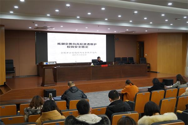 本网讯(通讯员:张炎 摄影:翟漱文)为深入学习贯彻习近平总书记关于意识形态工作的重要指示,进一步提高我校各级做好意识形态工作的能力和水平,2月16日下午,合肥市公安局国保支队王军大队长应邀来校开展意识形态工作专题辅导授课,高新国保大队大队长谢飞、校长助理邵玲、有关职能处室负责人、各二级学院行政副院长和全体辅导员参加,辅导培训由保卫处仇陶主持。