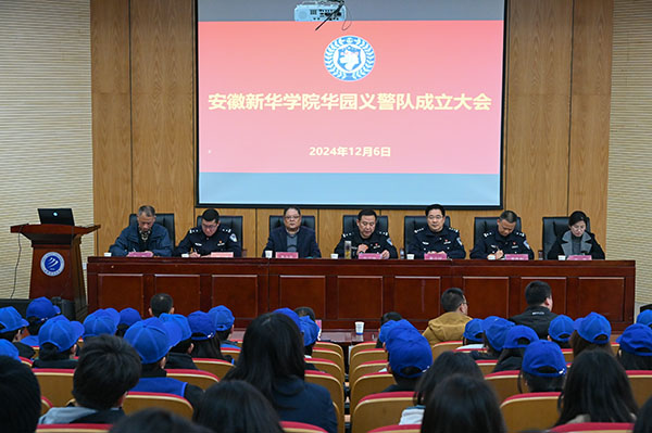 本网讯(通讯员:张大勇  摄影:翟漱文)12月6日中午,安徽新华学院华园义警队成立大会在学术报告厅举行。高新公安分局副局长张言波,治安大队教导员黄言斌,高新派出所教导员居巍,副所长董维彪,民警李伟、程永兵,安徽新华学院副校长李金星、相关职能部门负责同志和义警代表参会,会议由安全管理处副处长仇陶主持。