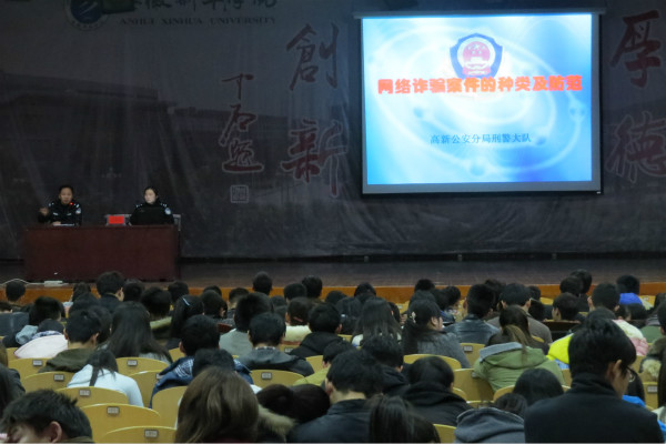 首先,刑警大队李警官详细讲述了网络上存在的10多种诈骗类型,即:中奖诈骗、QQ诈骗、购物诈骗、股票诈骗、网络钓鱼、企业邮箱诈骗、刷信誉诈骗、色情诈骗、购买机票诈骗、“引诱汇款”诈骗、利用任意显号软件诈骗、新型诈骗等,对网络诈骗作案特点和发案原因等进行了分析,重点阐述了针对不同诈骗类型应采取的防范措施。高新分局刑警大队王树生副大队长通报了近几年网络诈骗的发案情况,用现实生活中的典型案例,向每位参训人员阐述了网络诈骗带来的危害,要求广大师生增强安全防范意识,提高辨别能力。