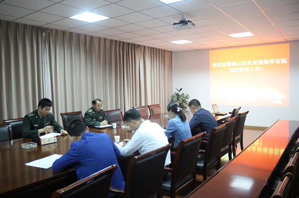 首先王丽代表学校对张汉田等一行表示热烈的欢迎,同时对蜀山区武装部近年来给予我校工作的支持和帮助表示感谢。陈义盛详细介绍了我校武装部的组织架构及相关职能,同时重点汇报了我校前期征兵工作开展情况及下一步工作措施。