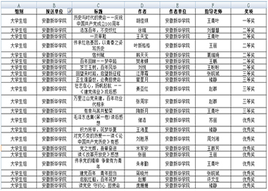 本网讯(通讯员:王青叶)日前,由安徽省委教育工委、省教育厅、省人力资源和社会保障厅、省文化和旅游厅、省新闻出版局、团省委等联合主办的安徽省第五届校园读书创作活动获奖名单公示结束,我校在本届活动中再创佳绩。大学生组一共21人获奖,教师组3人获奖,此外还获优秀指导老师奖1人。
