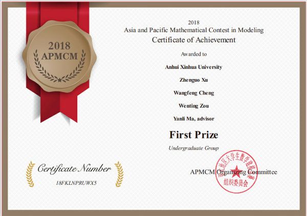 本网讯(通讯员:王玲)近日,2018年APMCM亚太地区大学生数学建模竞赛成绩揭晓,我校学生徐振国、邹文婷、程王峰在教师马艳丽的指导下荣获一等奖,这也是该团队继2018年全国大学生数学建模竞赛取得安徽赛区一等奖之后,再次在高水平大赛中荣获佳绩。