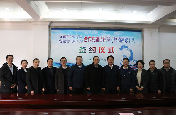 本网讯(通讯员:张爱臣)1月23日上午,安徽省体育局、安徽新华学院合作共建省冰球(轮滑冰球)队签约仪式在安徽省体育局举行, 仪式决定采取“双方共建、以校为主、省队校办”的合作模式,联办省冰球队和轮滑冰球队。