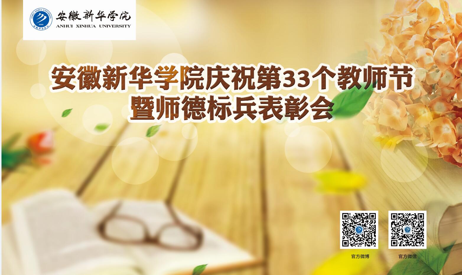 本网讯(赵彩虹,摄影:金政、程伟俊)金风送爽,硕果飘香,正值第33个教师节来临之际,9月8日下午,安徽新华学院庆祝第33个教师节暨师德标兵表彰大会在新闻演播厅顺利召开,新华集团常务副总裁、学校董事长陆真,集团副总裁、学校董事黄源,校长石秀和,副校长杨世国、王可、李金星,校长助理朱兆健出席大会,荣获“师德标兵”荣誉称号的全体教...