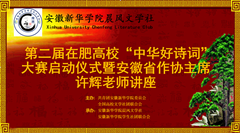 本网讯(通讯员:司长安)11月5日上午,第二届在肥高校“中华好诗词”大赛启动仪式暨安徽省作家协会主席许辉讲座在我校学术报告厅举行。本次活动由全国高校文学社团联合会、共青团安徽新华学院委员会主办,我校科技学院晨风文学社和学生社团联合会承办。