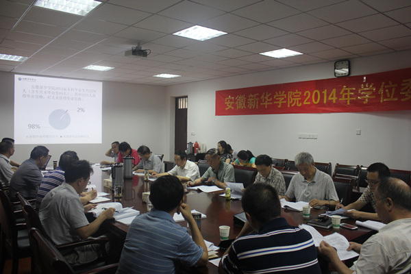 本网讯 (黄伟)6月20日上午,我校2014届本科生学位授予审核评定会在第一会议室召开,会议由院长、校学位评定委员会主任委员石秀和教授主持,副主任委员杨世国教授、马凤余教授出席了会议,17位委员参加了会议。会议对我校2014届学位授予审核情况进行讨论和审议。