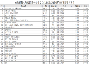 本网讯(通讯员:严素霞)近日,由省委教育工委、省教育厅、省人力资源和社会保障厅、省文化和旅游厅、省新闻出版局、团省委共同主办的安徽省第七届校园读书创作活动落下帷幕,我校师生在本次活动中喜获佳绩,获得各类奖项共32项,其中一等奖4项、二等奖5项,三等奖10项,优秀奖13项。获奖名单如下: