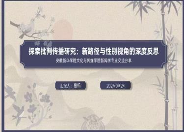 本网讯(通讯员:曹杨)2025年9月24日,安徽新华学院文化与传媒学院新闻学专业在教8-103开展了以“探索批判传播研究:新路径与性别视角的深度反思”为主题的学术研讨会,新闻学专业教师、圣彼得堡国立大学媒介传播与新闻学博士候选人曹杨,结合此前参与复旦大学第十四届 “新媒体与全球信息社会的公正传播” 研究生暑期学校的学习经历作专题汇报。...