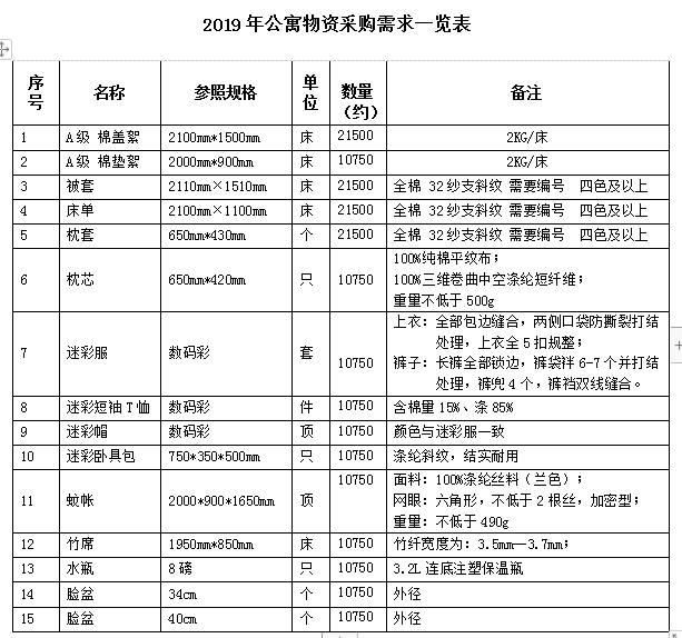 现对集团学历教育下属各单位2019年新生公寓物资进行招标询价,欢迎有资质的供应商积极参与。