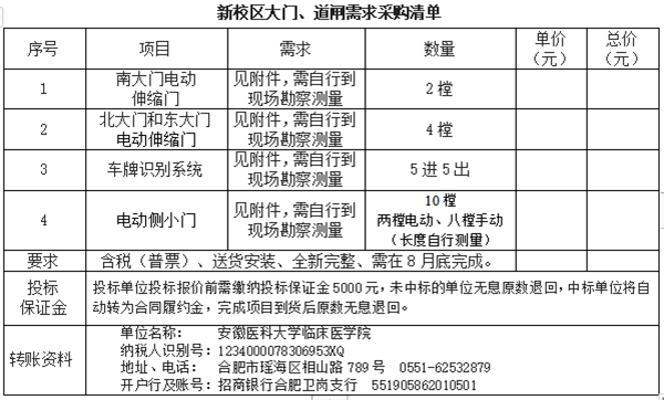 安徽医科大学临床医学院大门、道闸系统招标询价公告