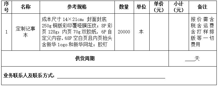 3.所有资料需加盖报价人公章后扫描发至询价人电子邮箱:xhjtcgb02@xinhuaedu.com,文件命名方式:公司名称+定制记事本项目报价函。