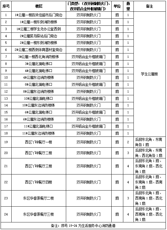 4.项目概况:根据消防管理要求及学校公寓楼实际需要,对1#、2#、3#、4#、6#、8#、10#、11#共计8栋学生公寓楼一楼消防通道和生活服务中心消防通道安装电磁锁装置,总计38扇消防通道。