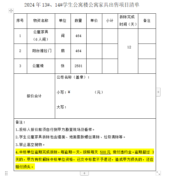根据改造计划,拟现对我校13#、14#学生公寓楼公寓家具进行公开出售,欢迎符合要求的优质商家参与。