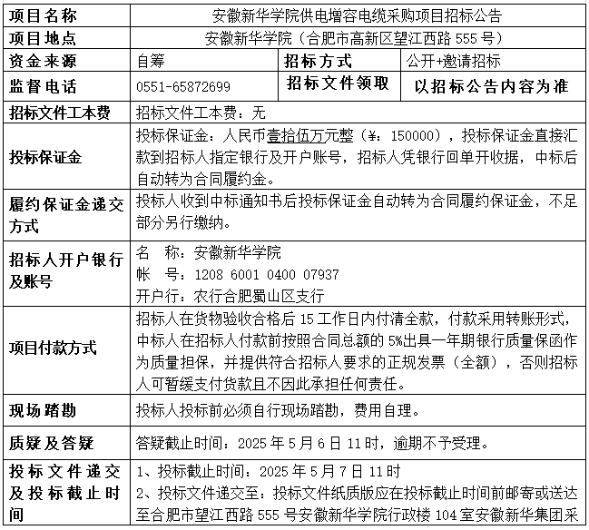 因单位需求,现对集团旗下安徽新华学院供电增容电缆采购项目进行招标采购,欢迎全国范围内符合条件的供应商投标参与。