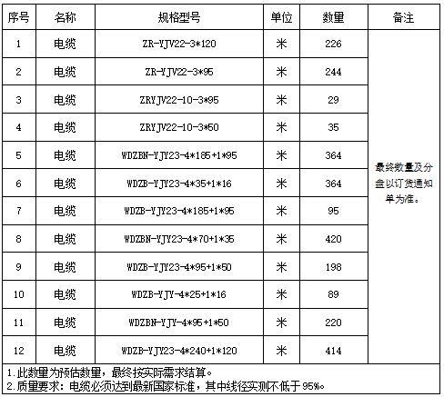 1.1样品要求:规格型号WDZBN-YJY23-4*185+1*95和WDZB-YJY23-4*240+1*120,长度不低于20cm。