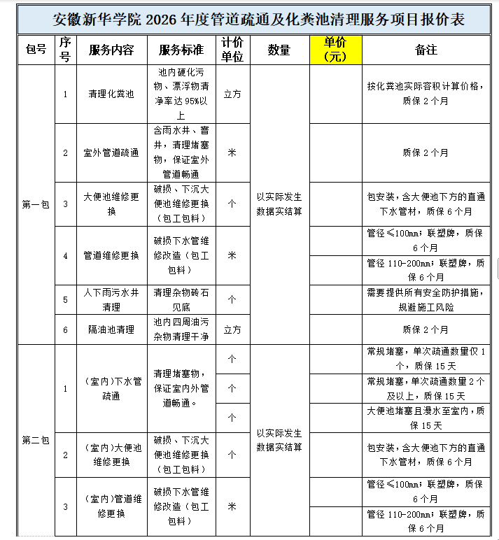 安徽新华学院2026年度管道疏通及化粪池清理服务项目询价公告