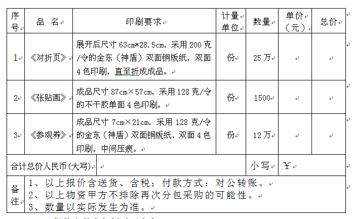 2、询价项目:《对折页》、《张贴画》、《参观券》。
