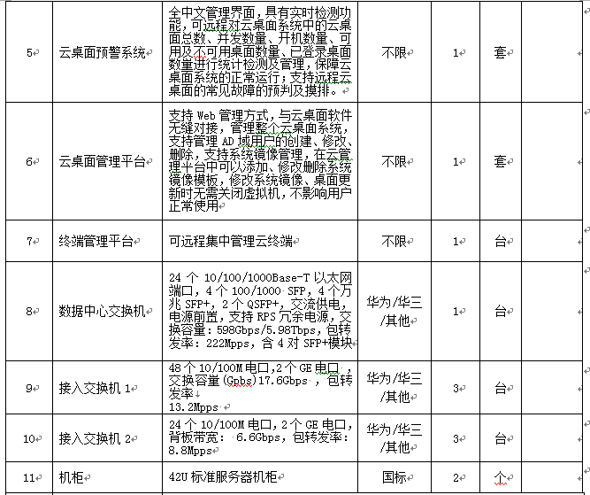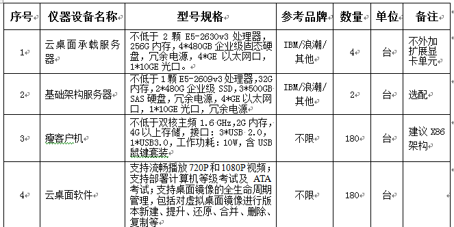 3、招标内容:三间机房共计180个点的云桌面,考虑到后期扩增建设,其中服务器集群部署到专用弱电间机房,同时考虑共享存储支持及可扩展后期GPU虚拟化支持。(具体设备规格参考如下但不局限于此:以客户机性能体验为主,要求客户机最低配置:内存≥3G、显存≥256M)