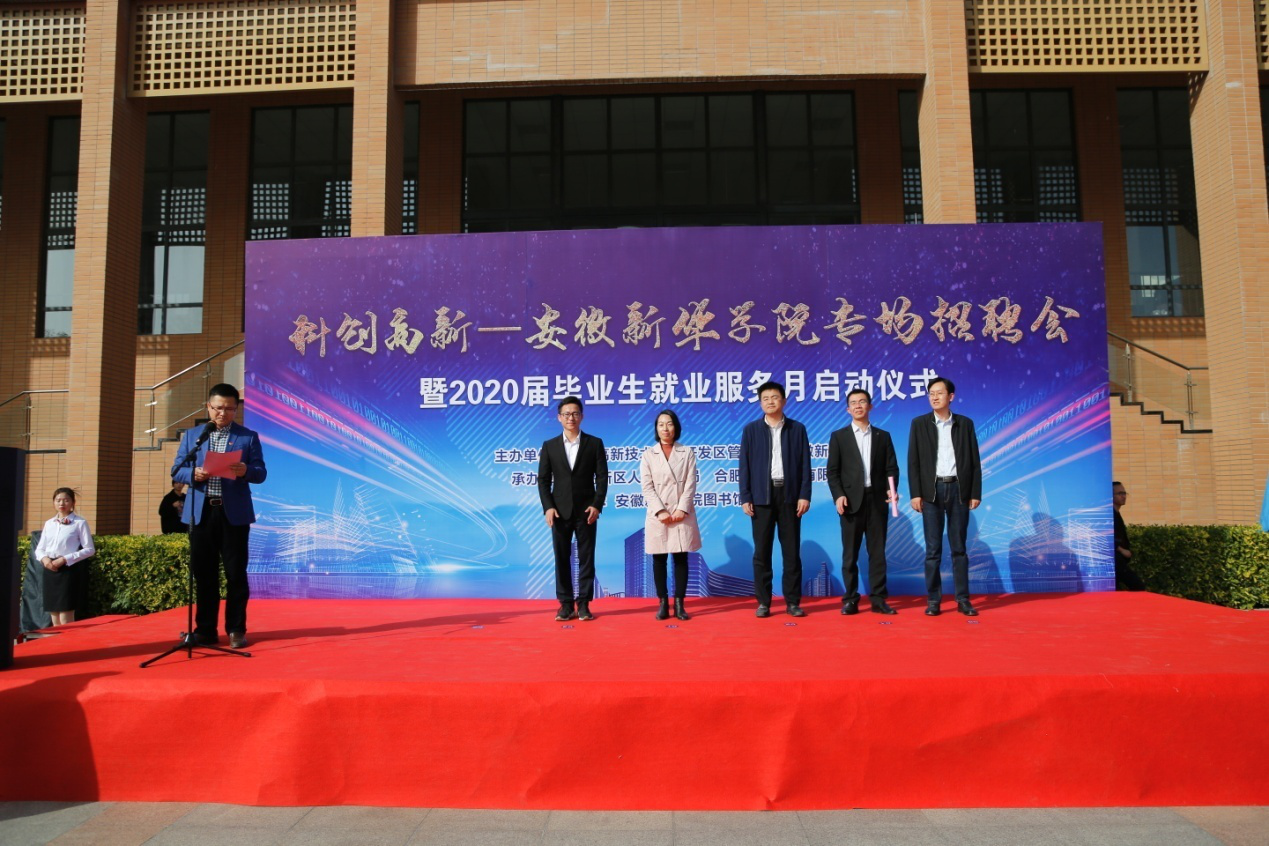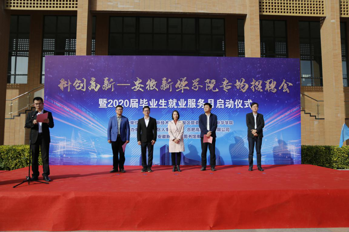 本网讯(通讯员:罗振林)蜀山南麓,如琴湖畔,秋色盎然,10月30日,由安徽新华学院与高新区管委会联合主办的“科创高新—安徽新华学院专场招聘会暨2020届毕业生就业服务月启动仪式”在学校图书馆南广场顺利举行,常务副校长王丽、合肥高新区管委会主任助理张建军、合肥高新区管委会人事局副局长姚笛、副校长方纯洁、合肥高新区管委会高创公司董事长兼总经理许永、校长助理贺行佳、高新区人事劳动局就业保障处处长张力、合肥高创股份有限公司创新平台管理部经理张晨等出席了此次活动,启动仪式由贺行佳主持。