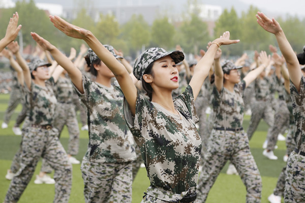 分列式表演结束后,3个学生方队进行了军体拳、韵律操、军歌合唱等训练成果汇报。