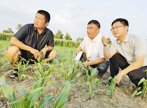 徐旭东(右一)和爷爷徐淙祥、父亲徐健(左一)在示范田分析夏玉米生长状态
