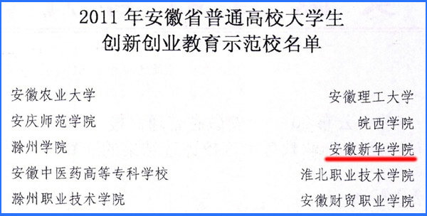 近期,安徽省教育厅公布了“2011年安徽省普通高校大学生创新创业教育示范校”评选结果,我校顺利通过评审,与安徽理工大学等10所学校一起被授予该称号。