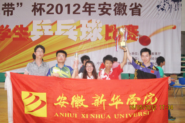 5月16日下午,由安徽省教育厅主办、安徽财经大学承办的2012年安徽省大学生乒乓球比赛在安徽财经大学落下帷幕,我校学子王海波、董方曦、吴小龙代表学校参加比赛,获得了本次比赛甲组男子团体冠军。