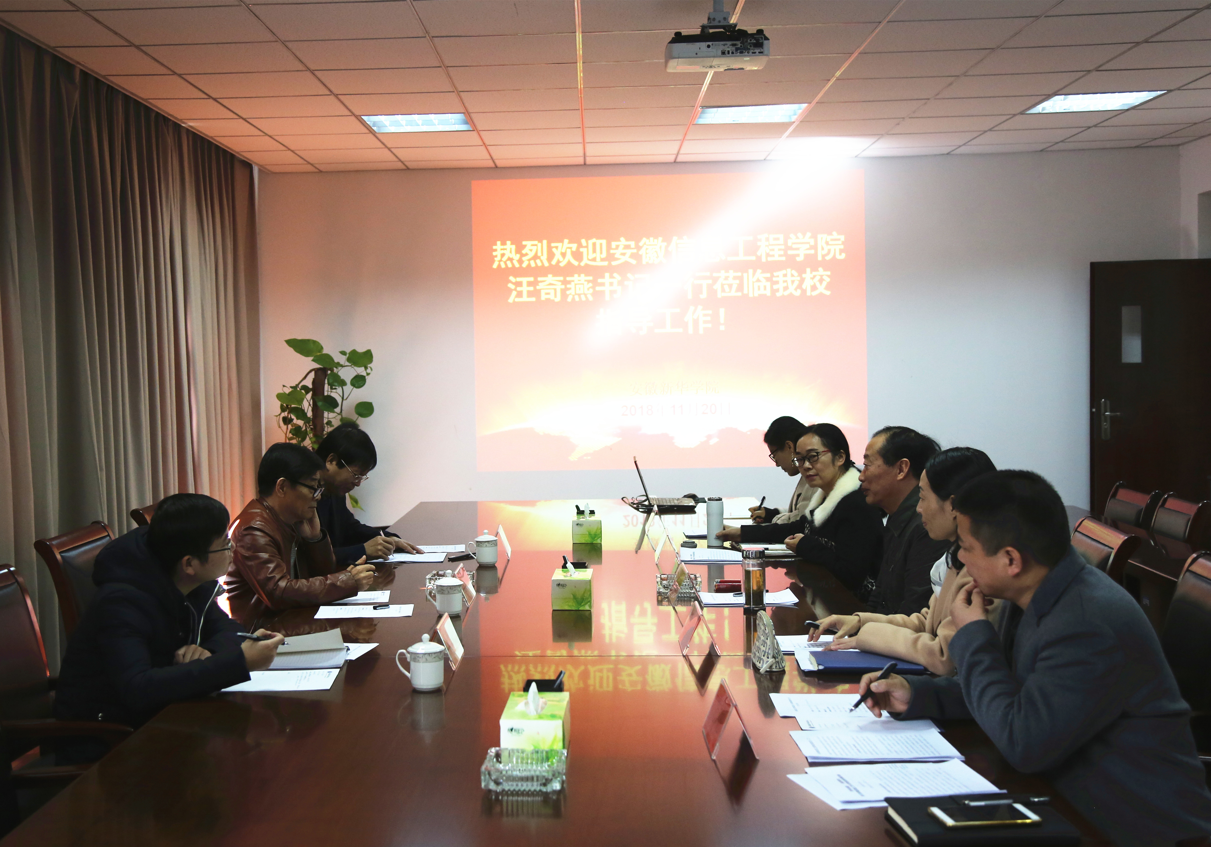 本网讯(通讯员:程海青)11月20日上午,安徽信息工程学院党委书记汪奇燕、党委办公室主任袁龙喜、党务专员阚海峰一行来我校就党建工作和学校发展进行考察交流。省督导专员、校党委书记储国定,常务副校长王丽,学校办公室(发展规划处)主任盛晓青及党委组织部相关人员等参与接待。