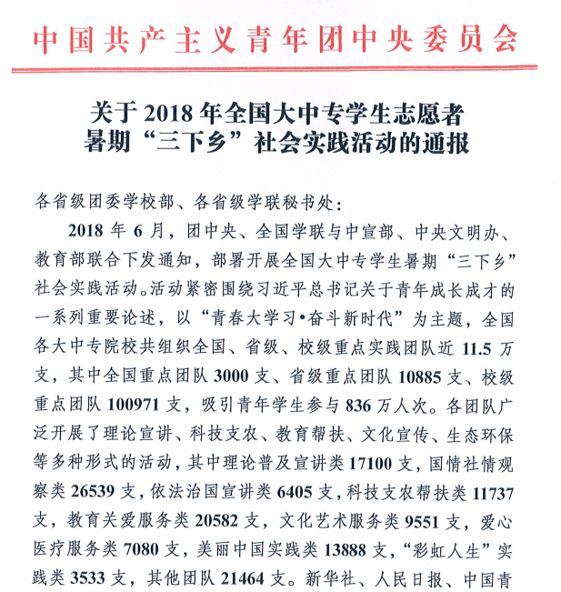 为深入学习贯彻习近平新时代中国特色社会主义思想,按照《中共中央宣传部等关于深入学习贯彻党的十九大精神广泛组织开展文化科技卫生“三下乡”活动的通知》的有关要求,引领教育广大青年学生勇做担当民族复兴大任的时代新人,以实际行动助力精准扶贫,服务乡村振兴战略,切实在感受改革开放40年取得的新成就新面貌的生动实践中受教育、长才干、作贡献,我校于6月至9月组织开展暑期文化科技卫生“三下乡”社会实践活动(以下简称“三下乡”社会实践活动),其中有2支校级全额资助重点实践团队,10支院级重点实践团队。