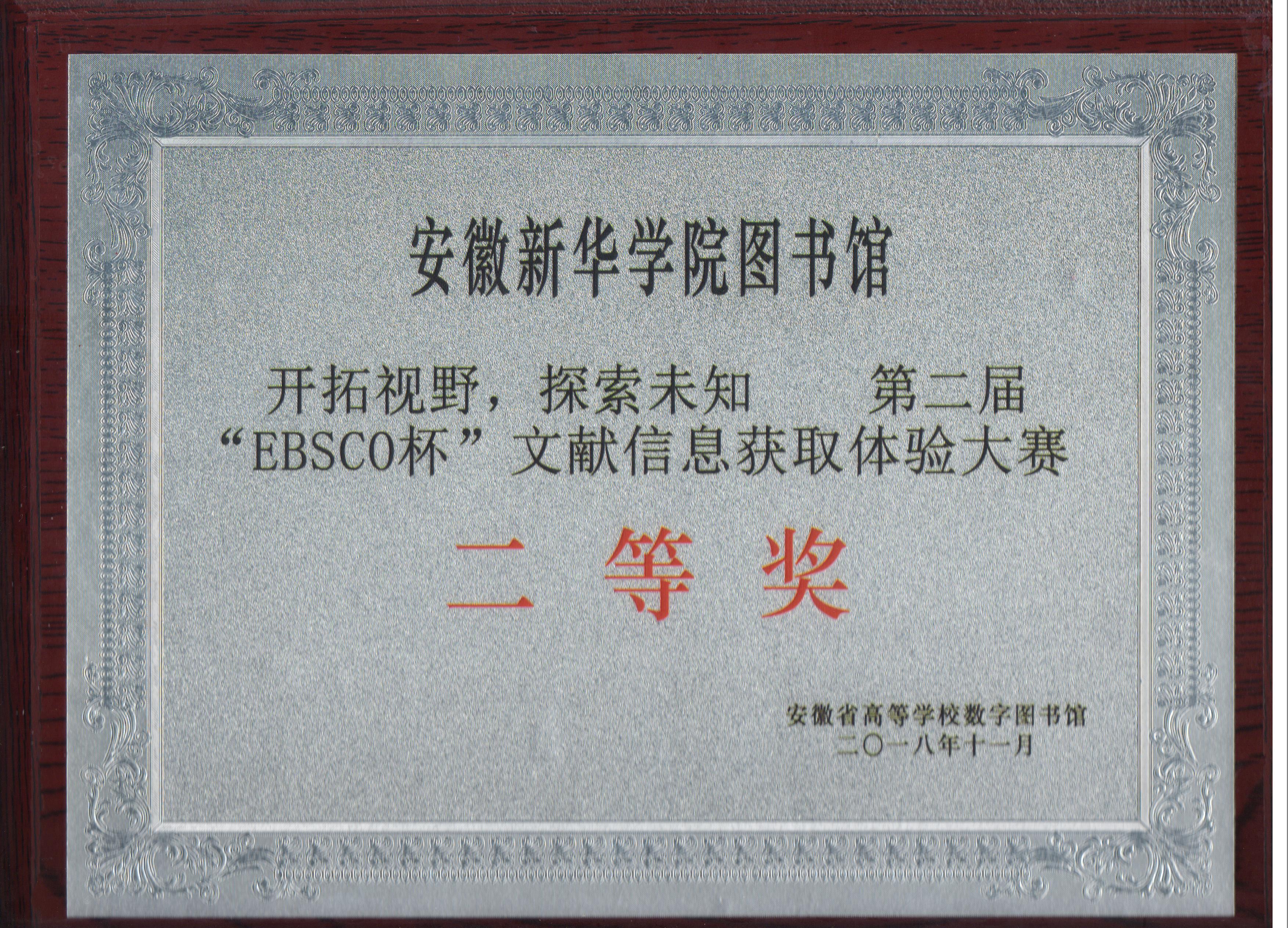 本网讯(通讯员:彭丹)近日,2018年度EBSCO安徽省高校图书馆外文资源建设研讨会暨EBSCO第二届文献信息获取体验大赛颁奖活动在安徽农业大学举行。省内30余所高校图书馆工作人员齐聚一堂,参加本次研讨会及颁奖仪式。我校图书馆荣获第二届“EBSCO杯”文献信息获取体验大赛二等奖。