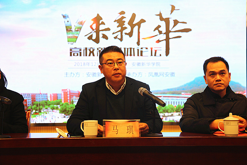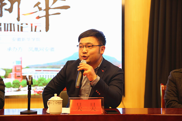 随后,吴昊代表凤凰网安徽致辞。他从新媒体形态的发展角度出发,强调了新媒体思维的重要性。他表示,新媒体思维即为学习的思维,凤凰安徽将继续关注高校的发展,希望日后能够与我校形成更加紧密的合作关系,利用凤凰网平台优势,诠释新华,讲好新华教育发展故事。