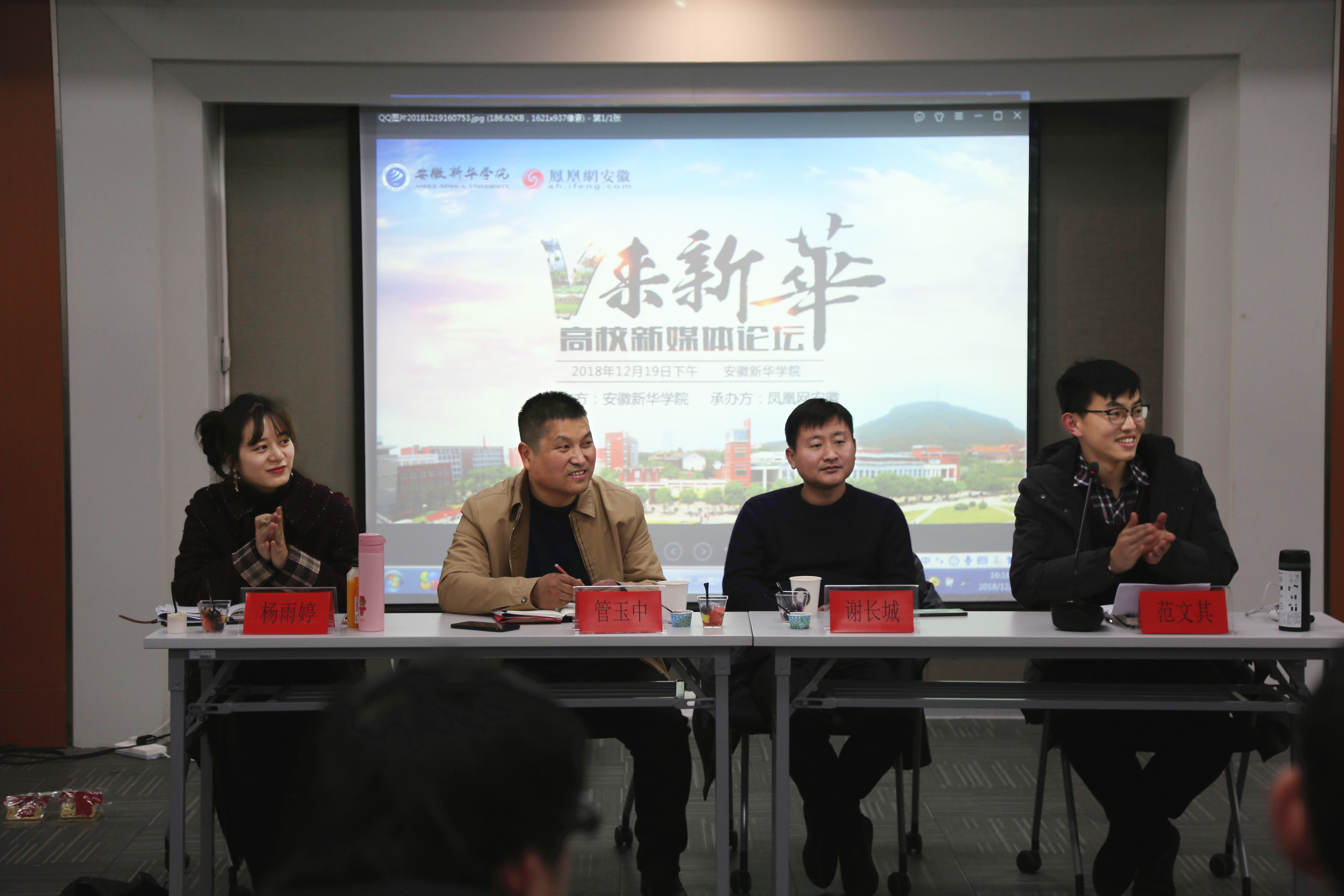 本网讯(文:赵彩虹 图:金政)12月19日下午,“V来新华”高校新媒体发展论坛在文传演播厅举行,副校长马琪,安徽省网络媒体协会会长、人民网安徽运营总监宫礼,凤凰网安徽总经理兼总编辑吴昊,校长助理黄君婕,文化与新闻传播学院执行院长翟荣兵,凤凰网安徽营销中心副总经理谢长城出席,合肥“大V”,各职能部门、二级学院相关人员及学生代表参加。本次论坛由宣传处处长管玉中主持。