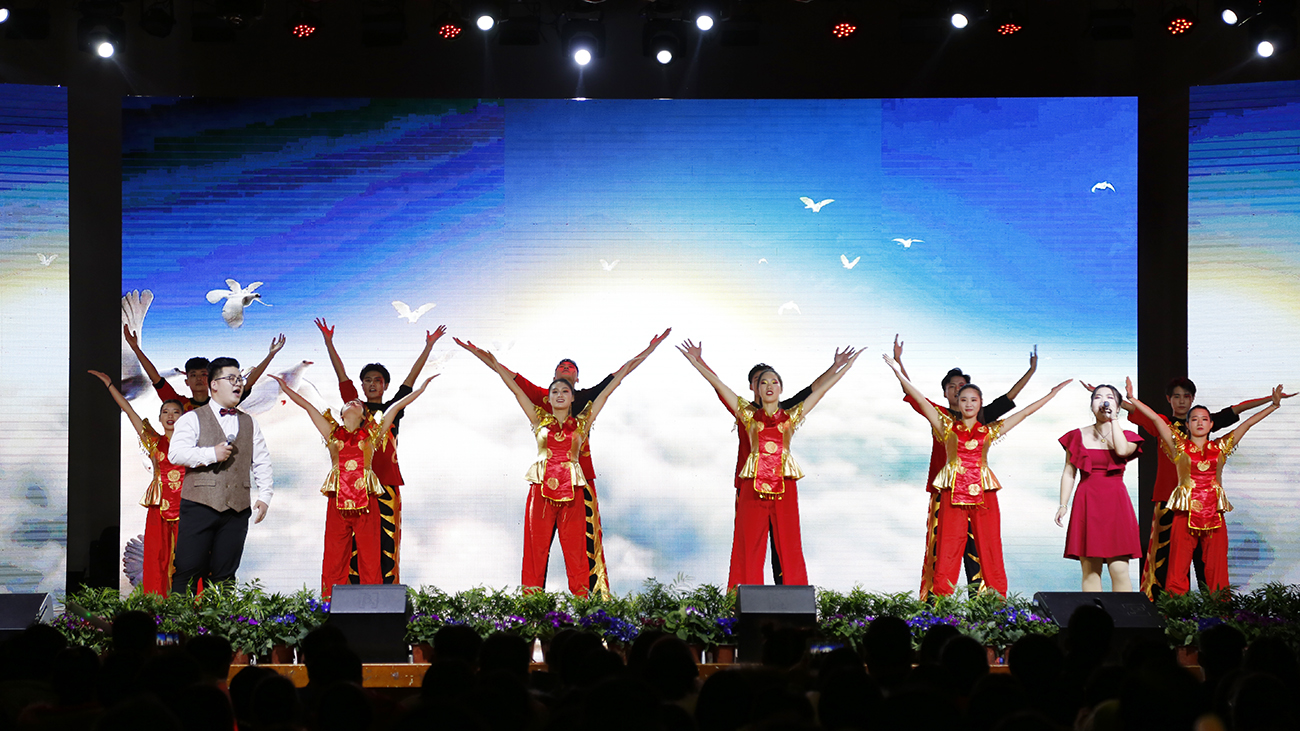 最后,教师范文其、杨光、孙珊珊、叶文慧一曲《祝福新华》为晚会画上了圆满的句号。