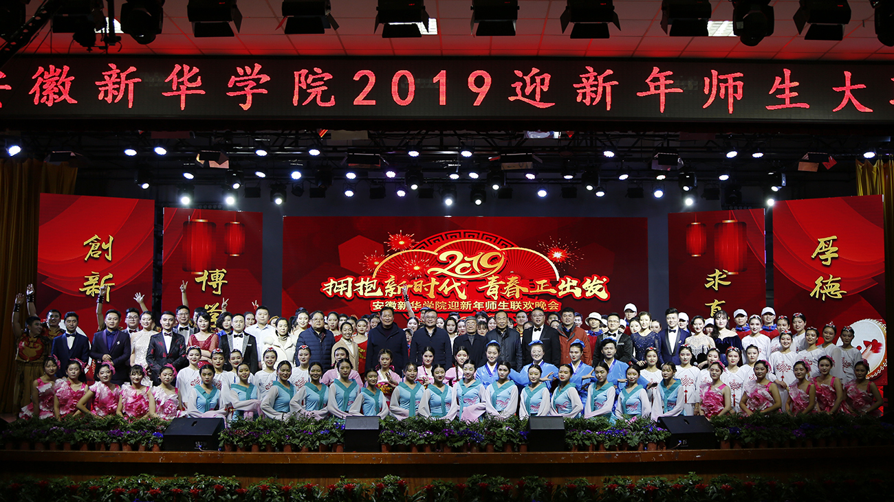本网讯 (通讯员:王亚君 摄影:宣传处、摄影工作室)12月27日、28日晚,“拥抱新时代,青春正出发”2019安徽新华学院迎新年师生联欢晚会在校大礼堂隆重举行。集团领导及校领导出席晚会,华园师生共聚一堂,列席观看。