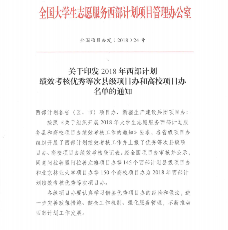 本网讯(通讯员:邢长露)近日,共青团中央、全国大学生志愿服务西部计划项目管理办公室公布了《关于印发2018年西部计划绩效考核优秀等次县级项目办和高校项目办名单的通知》,根据西部计划项目办绩效考核结果,我校荣获“2018年度全国西部计划优秀高校项目办”称号。
