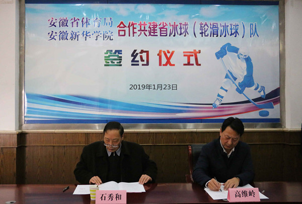 本网讯(通讯员:张爱臣)1月23日上午,安徽省体育局、安徽新华学院合作共建省冰球(轮滑冰球)队签约仪式在安徽省体育局举行, 仪式决定采取“双方共建、以校为主、省队校办”的合作模式,联办省冰球队和轮滑冰球队。