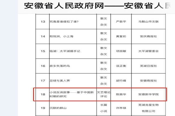 本网讯(通讯员:刘慧)近日,我校文化与新闻传播学院陈振华博士凭借文学评论专著《小说反讽叙事——基于中国新时期的研究》荣获2013—2016年度安徽社会科学奖三等奖实现了我校科研成果省部级政府奖项的突破。