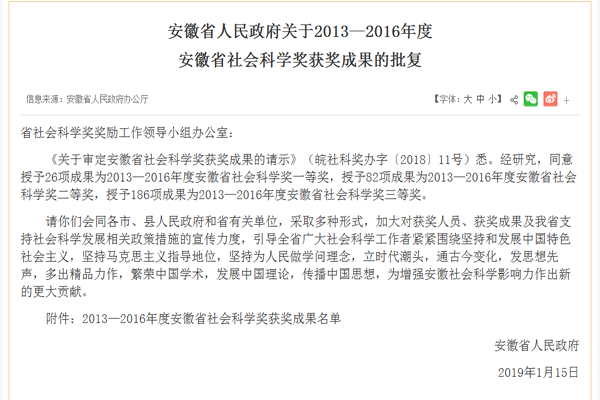 据悉,安徽社科奖是安徽省政府奖项,是安徽哲学社会科学最权威、最高的奖项。2017年3月30日,安徽省人民政府办公厅印发《安徽省人民政府办公厅关于印发安徽省社会科学奖奖励办法的通知》,重新恢复中断了6年的安徽社科奖评选。此次奖项经过多轮评选,终评最后在中国社科院由全国遴选的专家评定。2018年10月评审结果在《安徽日报》公示,2019年1月22日由省政府批复并对社会公布,该奖项最终尘埃落定。