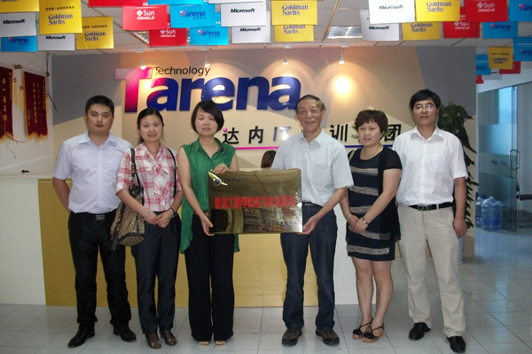 达内集团合肥实训中心经理周慧首先引导程家兴等参观了实训中心的办公场所和学生上课教室。周慧介绍达内科技集团是中国高端IT培训与人才服务、教育软件研发领导品牌,10年来在国内已经建立五十余家实训中心,在安徽省也与多所院校建立校企合作关系,每年培训的学生近千人,很大程度上协助学生的实践学习,作为高校教育的补充力量,搭建学生与用人单位无缝对接的桥梁。程家兴肯定达内科技集团的定位,从培训到就业的一体化服务更加鲜明,帮助学生更好地就业。他说:“信息工程学院在进行教育教学改革的出发点是以学生为本,把教学转化为实践成果。毕业生只有找到最佳的发展途径,才能在包围圈中突破出来。”双方在签订建立实习实训基地协议后,深入商讨合作事宜,提出横向课题的合作。双方达成共识,以服务学生为基本出发点,实现互助共赢的好局面。
