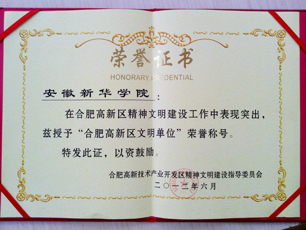 6月11日,合肥高新区精神文明建设表彰大会在高新区管委会召开,我校获得文明单位荣誉称号,人事处相关人员代表我校参会并接受表彰。
