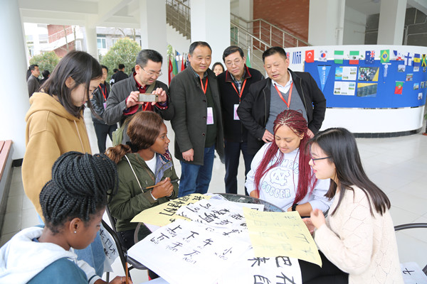 学生志愿者首先向与会嘉宾介绍了位于图书馆二楼正在展出的校创新创业成果展,详细讲解了学校“三个三位一体”人才培养模式以及“学、用、创”创新创业教育体系。随后,与会嘉宾来到了国际教育学院、留学生事务管理办公室,并与学校外教和部分外籍学生进行了简短交流。