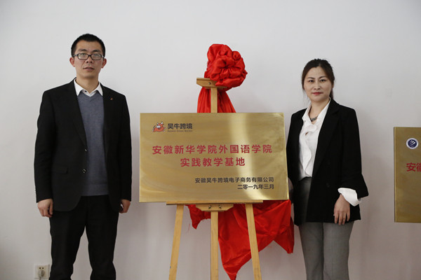 随后,外国语学院先后与两家企业负责人举行签约仪式。在热烈的掌声中,方纯洁与陈莹莹分别为“安徽新华学院外国语学院实践教学基地”“安徽昊牛跨境电子商务有限公司人才培养基地”揭牌。