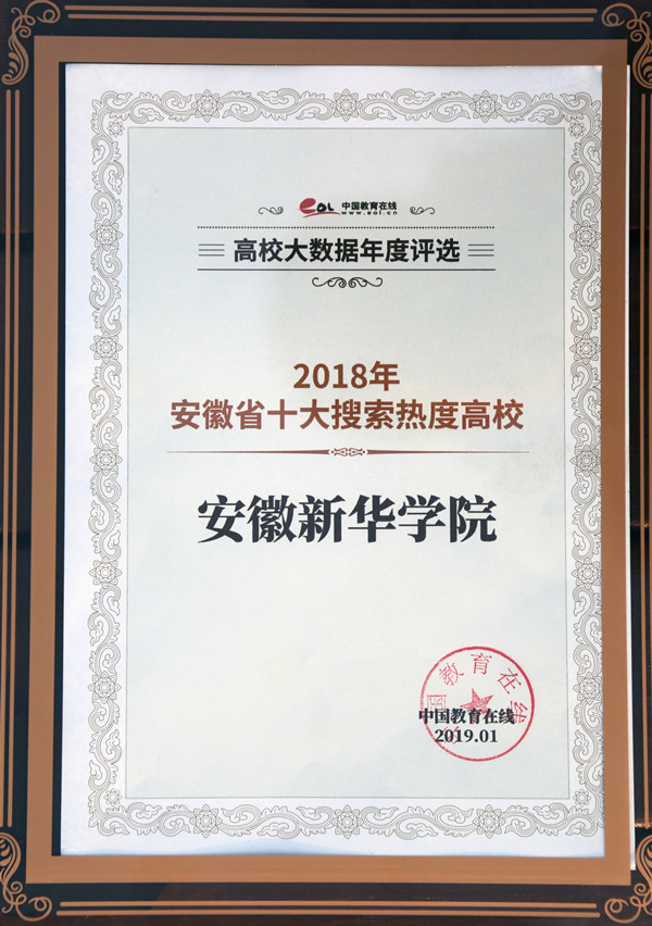本网讯 (通讯员:赵彩虹)近日,中国教育在线2018年 “高校大数据年度评选”榜单发布,我校荣获“安徽省十大搜索热度高校”。