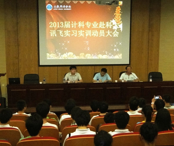 为了进一步更新人才培养观念,推动创新人才培养模式。6月21日下午,信息工程学院2013届计算机科学与技术专业学生赴科大讯飞教育实习实训动员大会在学校学术报告厅召开,副院长马凤余出席会议,科大讯飞杨任,信息工程学院院长程家兴教授,全体计算机科学与技术专业学生参加动员会。