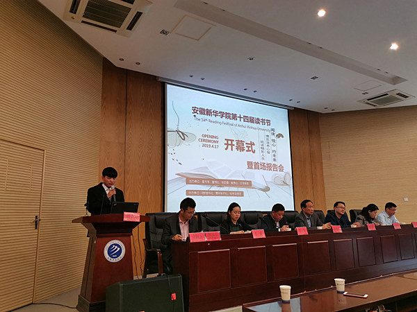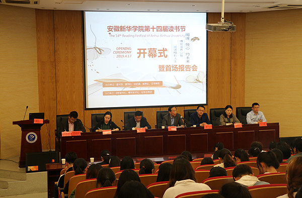 本网讯 (通讯员:王青叶)为响应“全民阅读”的号召,进一步倡导校园读书之风,提升校园文化软实力,我校将于4月17日至5月22日举办第十四届“安徽新华学院读书节”活动。4月17日下午,读书节开幕式在学术报告厅拉开帷幕。副校长杨世国、图书馆副馆长汤干君、学生处副处长王飞、教务处副处长濮明月、宣传处处长助理李曦、文化与新闻传播学院院长助理兼中文系主任王鹏、特邀嘉宾文化与新闻传播学院副教授张岚及部分师生代表共同参加了开幕式,开幕式由图书馆副馆长邵国川主持。