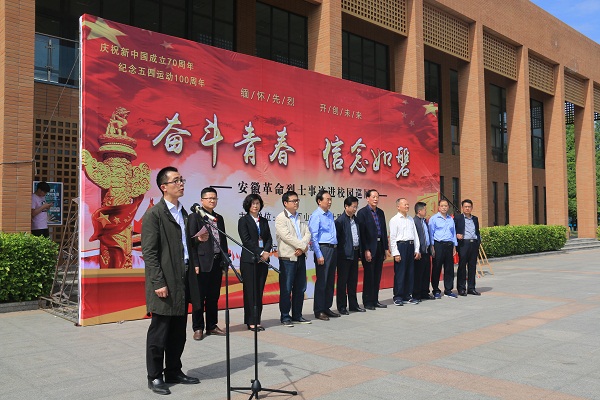 本网讯(通讯员:董丽娟)青春激荡一百年,五四精神薪火传。5月8日下午, “奋斗青春、信念如磐”安徽革命烈士事迹进校园巡展开幕式在我校图书馆南广场举行。来自合肥市退役军人事务局、合肥蜀山烈士陵园管理处、合肥新四军历史研究会的领导和专家与我校学子共同纪念“五四”运动一百周年,回顾革命光荣历史、传承英烈精神。